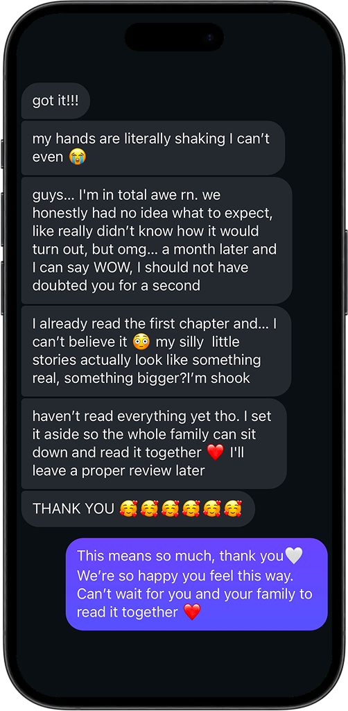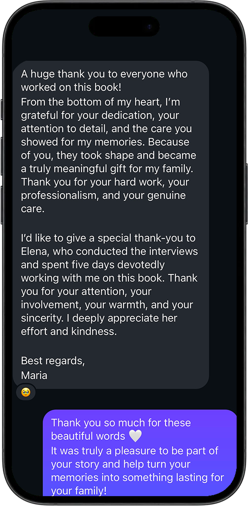 A professional editor transforms your interview into a beautifully written collection of stories, carefully preserving your voice, tone, and the way you express yourself.