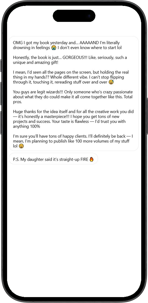 Before your book goes to print, you receive a digital draft. You would have a chance to review your book, make corrections, add photos, and choose the color of your book’s cover. Once everything is approved, we print your book and ship it to you in elegant gift packaging.