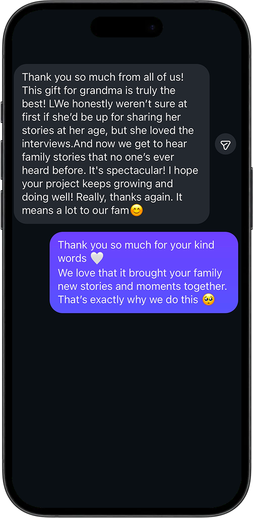 Our interviewers guide each conversation with warmth and care, helping you reconnect with the past, uncover defining moments, and turn them into a wonderful and unique narrative. In doing so, your experiences, your voice, and your heart would live forever, carried forward and treasured by generations to come.
