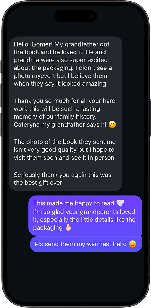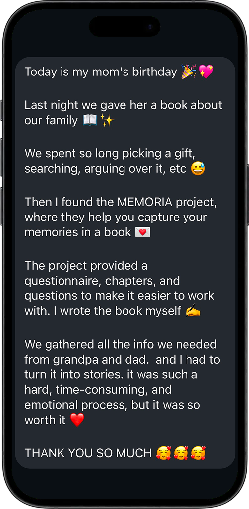 Our books preserve the voices of grandparents, the wisdom of parents, and your memories. You share your stories with us, and we carefully craft them into a written collection you can hold in your hands. You may create a book for yourself — or to give as a gift to your loved ones.